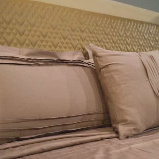 Immerse yourself in timeless elegance with the Classic Charm Bed Sheet Set. Crafted from pure cotton, this set features the bed sheet and matching designer cushion covers in a design of understated sophistication. The three fine stripe pintucks on the sheet and the delicate pleating on the cushion covers add a touch of classic charm, while the soft, breathable cotton ensures ultimate comfort. Subtle color palettes throughout the set create a modern and sophisticated look for your sleep haven. Experience the perfect blend of luxury and timeless style with this complete bed sheet set.
